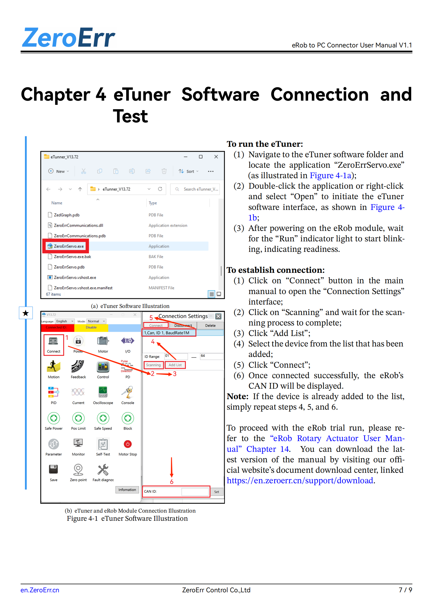 In Chapter 4, add instructions for eRob module test runs and improve the eTuner software connection steps.